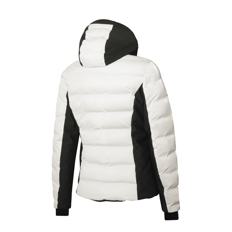 La giacca da sci da donna è progettata per garantire comfort e prestazioni elevate sulle piste. Con maniche preformate e l'innovativa tecnologia dei tunnel incollati, offre una tenuta sicura dell'imbottitura a fiocco iniettata, assicurando massima impermeabilità. Il cappuccio è regolabile e staccabile, mentre il bottone a pressione sul retro del collo mantiene tutto in posizione. Gli inserti in tessuto Soft Shell elasticizzato sui fianchi e sottomaniche garantiscono libertà di movimento. Con zip frontale impermeabile e tasche invisibili, questa giacca è pratica e funzionale. Polsini interni con foro per il pollice, fodera in velour e dettagli come il taschino porta ski-pass completano il design. La lunghezza di 63 cm nella parte posteriore (taglia S) la rende ideale per ogni avventura in montagna, combinando stile e protezione per le tue giornate sulla neve.